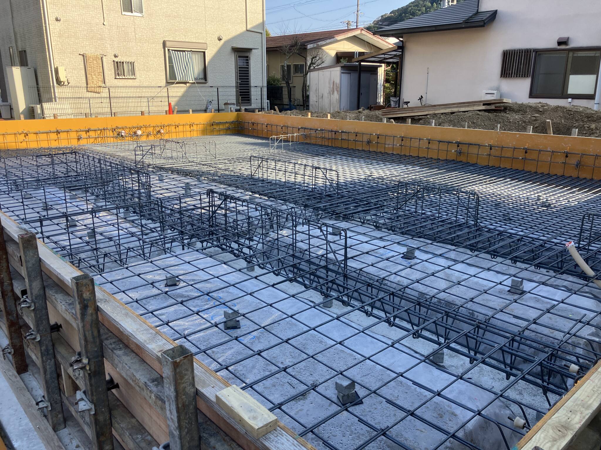 鉄筋の径・ピッチ・定着長さ・継手位置、かぶり厚(鉄筋表面からコンクリート表面までの距離)は耐久性と耐震性を左右します。スペーサー(サイコロ)で鉄筋を正しい高さに保持します。立ち上がりと底盤の一体性、開口補強、隅角部の補強筋など、図面上の指定を現場で確実に再現することがポイントです。