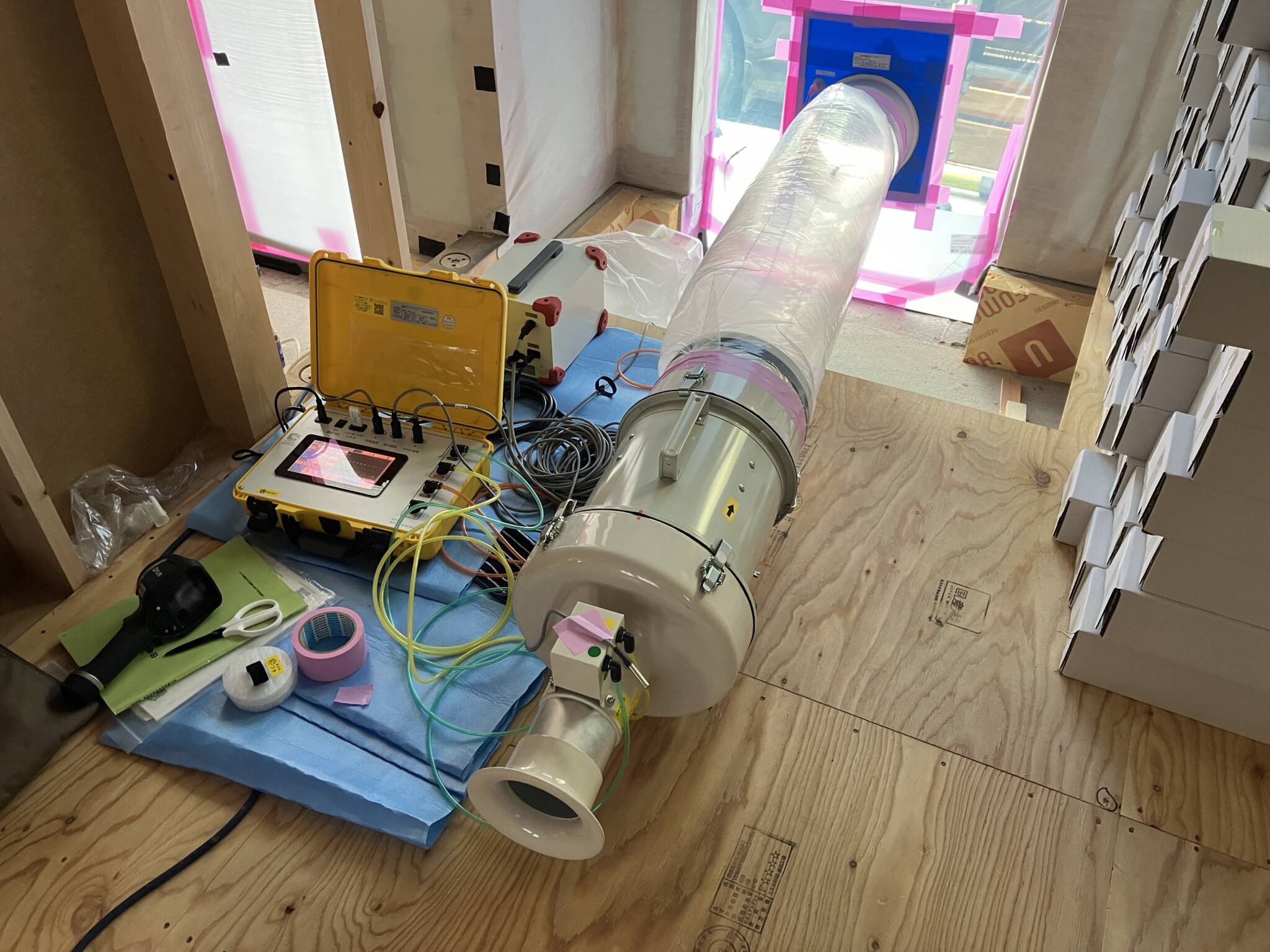 気密測定では、実際に専用の測定器で家の中を減圧し、どの程度の空気漏れがあるかを数値で確認します。