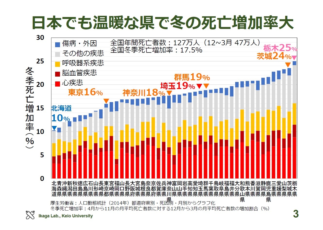 厚生労働省の人口動態統計をもとにした資料によると、日本では冬になると死亡者数が増加しますが、その増加率は必ずしも寒冷地で高いわけではありません。