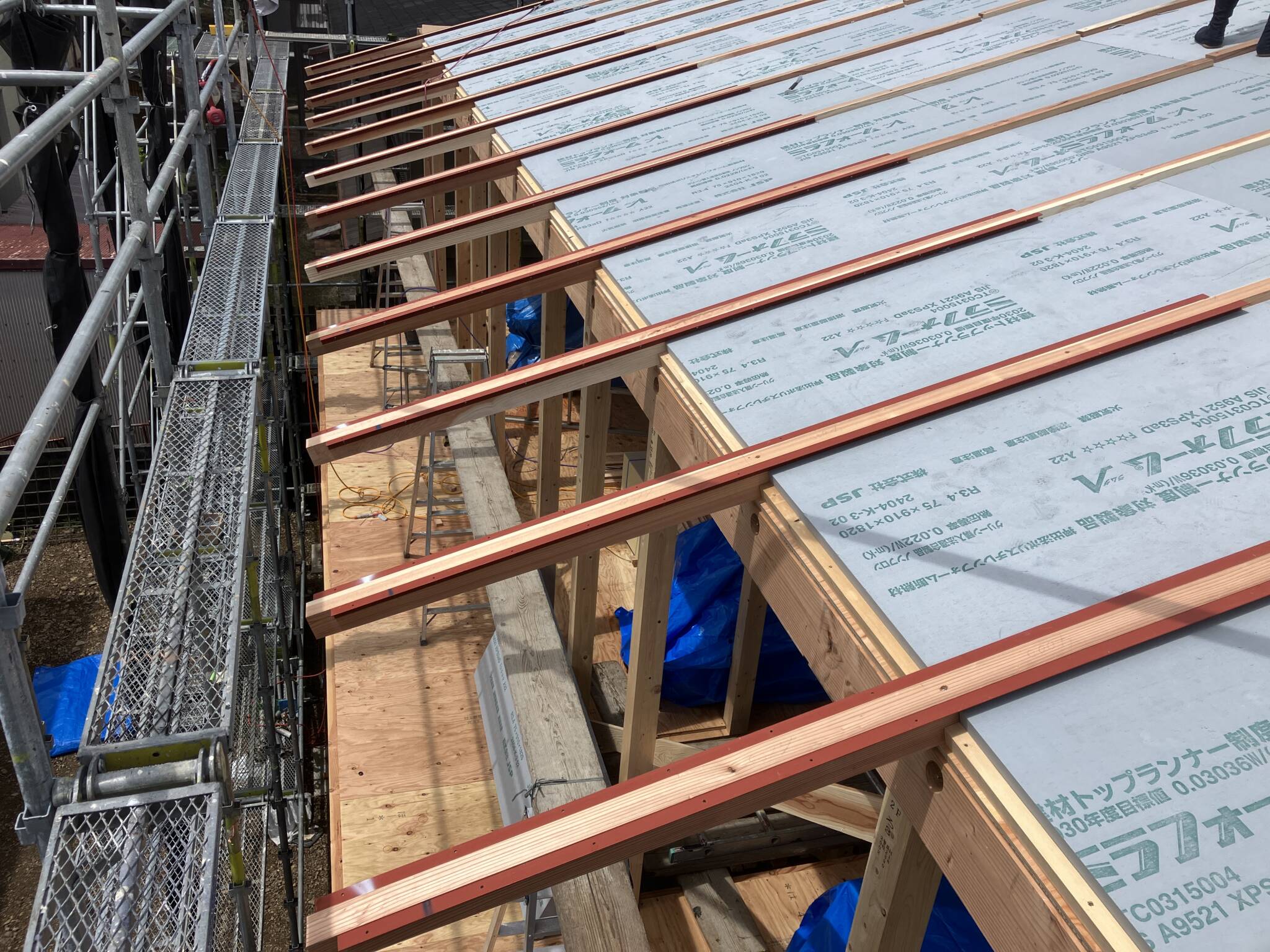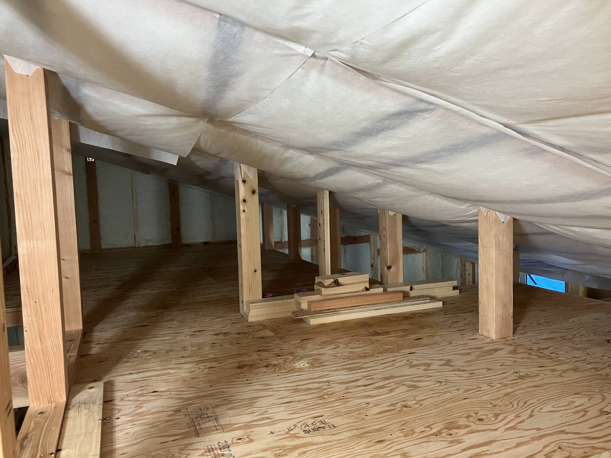 断熱材は、屋根には高性能グラスウールに押出法ポリスチレンフォームで付加断熱、